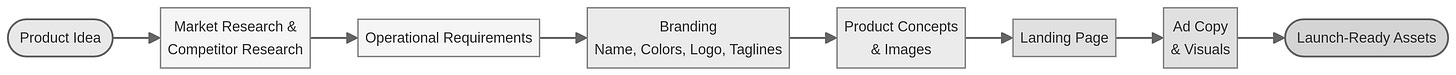 Testing a workflow to automate market research, competitor research, product concept images, landing pages, and ads in about 20 minutes for ~3.7USD.