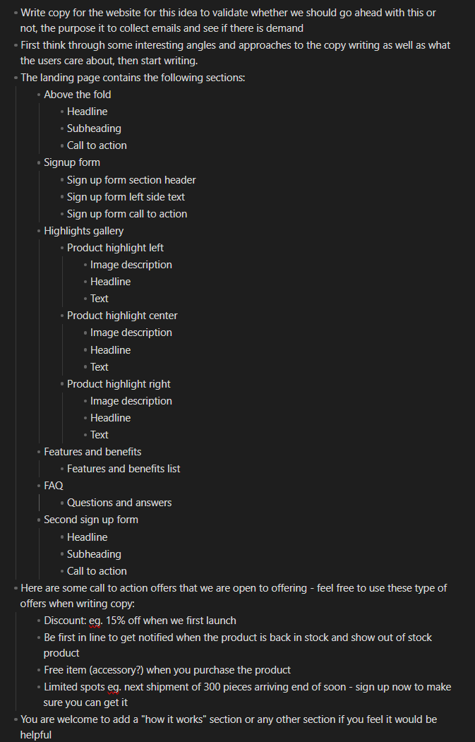 I have a skeleton structure for the landing page that I feed to the AI as well so it knows what kind of things to generate. In theory we are leaving some creativity on the table in terms of structure but a well formatted landing page is a good starting point and my hope is the speed we get out of this will make it worth it.