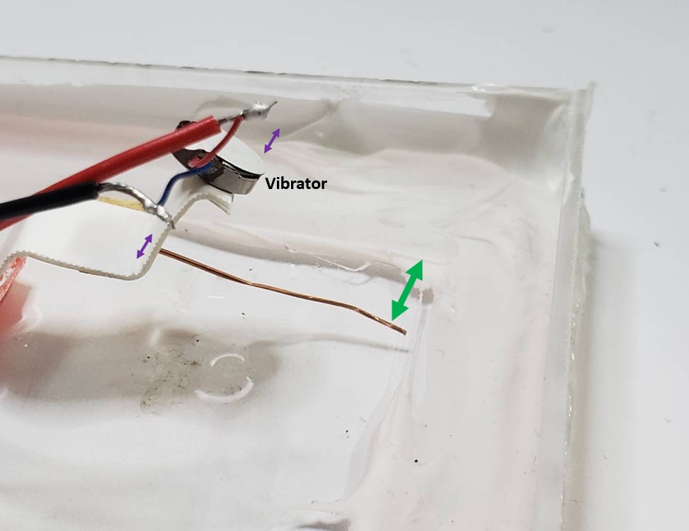 For the actuator I used a piezo-vibrator because it was the lightest moving thing I could find. Because vibrators aren't really designed for this use case, I had to try a bunch of different actuator combinations for this to work. The final set-up looked like this (the boat doesn't move because no soap is used in this demo):